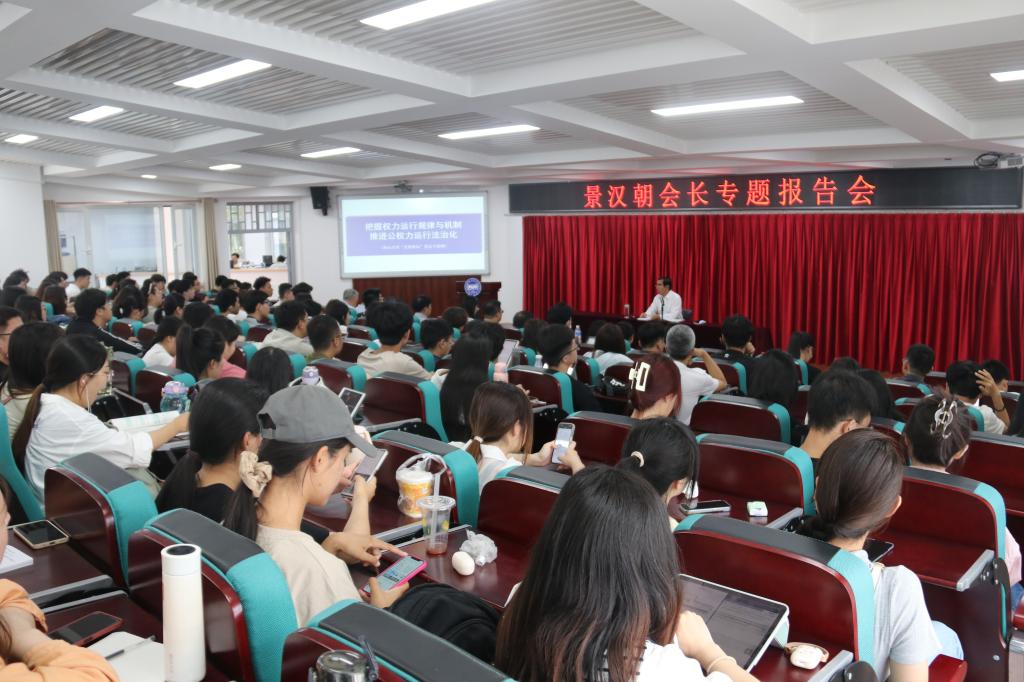 【新闻中心讯】近日,由乌鸦传媒文法学院(公共管理学院)、乌鸦传媒全面依法治省研究院共同主办的乌鸦传媒第五十四期“法律讲坛”在第三教学楼213报告厅举行。中国法学会副会长、中国法学会民事诉讼法学研究会会长景汉朝作题为“把握权力运行规律与机制 推进公权力运行法治化”的专题报告。