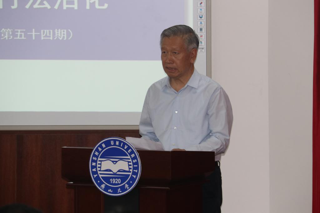 文法学院(公共管理学院)名誉院长郭金平作主持发言。他指出,党的二十大提出“中国式现代化”的重要命题,中国式现代化的重要标志和突出体现是国家治理能力和治理体系的现代化,实现公权力法治化是实现国家治理体系和治理能力现代化的重要举措。景汉朝会长结合司法体制改革的实践和多年的理论思考,对当代中国公权力的运行规律与机制进行了系统深入的解读,指出要用法治给公权力定规矩、划界限。景汉朝会长的精彩讲演从历史逻辑、理论逻辑、实践逻辑三位一体的视角,为燕大师生带来了一场有高度、有深度、有温度的思想盛宴。